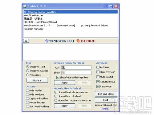 HiddeX是个免费的隐私工具,可利用热键快速隐藏任何应用程序窗口。同时还可隐藏任务栏上的程序按钮,通知区的图标,并且可一键静音。软件无需安装,解压即用。